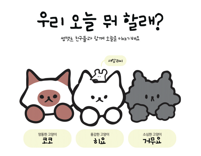 친구들과 함께 매일 즐겁고 신나는 경험을 하고 싶다는 생각에 썸캣츠를 기획했다. 슬로건도 ‘우리 오늘 뭐 할래?’다. 현실에서 있을 법한 또는 불가능한 모험이나 내 엉뚱한 상상력을 썸캣츠에 담았다. 썸캣츠와 모험을 떠나고 일상을 함께하며 추억을 만들고 즐거운 이야기를 나누면서 긍정의 에너지를 느끼게 하고 싶다.