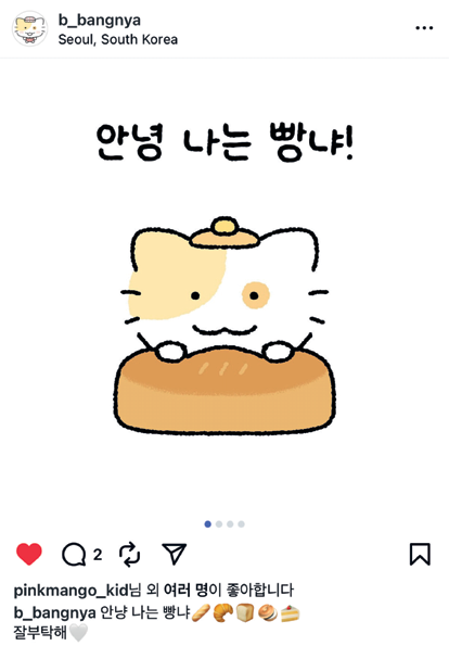 팬덤은 단기간에 만들어지는 게 아니라 캐릭터를 반복적으로 만나고 감정을 공유하는 과정에서 자연스럽게 형성된다고 생각한다. 그래서 빵냐를 한 번 보고 끝나는 캐릭터가 아니라 SNS를 통해 일상적인 에피소드를 꾸준히 보여주는 존재로 만들어 가고 있다. 작은 이야기들이 쌓이면서 팬들이 캐릭터의 감정과 상황에 공감하고, 점점 애정을 갖는 구조를 만드는 것이 목표다. 콘텐츠로 형성된 애정이 자연스럽게 경험과 소비로 이어질 수 있도록 캐릭터 세계관을 단계적으로 확장해 나갈 생각이다. 팬과 캐릭터가 함께 시간을 쌓아가는 관계를 그려본다. 최근에 빵냐 캔디 봉봉 스티커를 선보였는데 금방 완판될 정도로 반응이 좋다. 현재 빵냐 피규어 키링과 봉제 인형도 준비 중인데 기대가 크다. 앞으로 다채로운 상품을 출시하고 이모티콘, 영상 콘텐츠도 만들 계획이다.