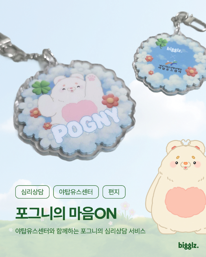 온라인 멘털케어를 위한 페르소나 AI 기술을 탑재한 이 제품은 캐릭터와 대화할 수 있는 기능이 있다. 청소년들은 NFC(근거리 무선통신) 칩이 든 키링을 스마트폰으로 태그하면 비글즈의 대표 IP이자 성남시청소년재단의 공식 홍보대사인 포그니 캐릭터와 편안하게 얘기를 나누며 자신의 고민을 상담할 수 있다.