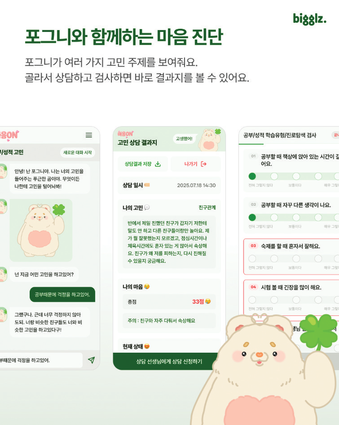 포그니 마음ON은 우리 사회에서 중대한 문제로 부각되고 있는 청소년 상담의 진입 장벽을 효과적으로 낮추는 역할을 해줄 것으로 기대를 모은다. 비글즈는 상담 과정에서 축적된 데이터를 토대로 청소년들의 주요 관심사와 고민을 분석할 수 있고, 이를 활용해 지속적인 AI 재학습이 이뤄지면 더욱 정교한 서비스 제공도 가능해질 것으로 전망하고 있다.