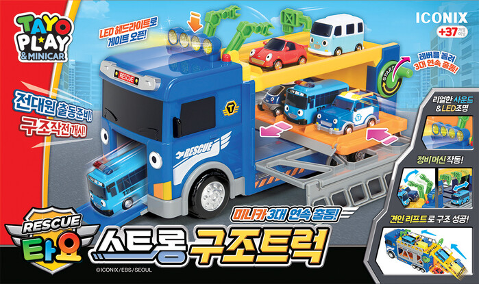 아이코닉스도 다채로운 신규 완구를 선보였다. 여러 대의 미니카를 실을 수 있는 타요 스트롱 구조트럭은 레버를 돌려 3대의 미니카를 연속으로 출동시킬 수 있으며 구조 트레이와 견인 리프트 , 정비 머신으로 미니카를 구조하거나 움직이고 수리할 수 있는 기능들을 갖췄다.