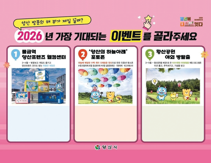 시는 ‘양산 방문의 해’를 계기로 관광 캐릭터 활용 홍보 및 양산12경을 중심으로 한 관광 스토리텔링 강화, 시민 참여형 관광 프로그램 확대 등을 통해 관광도시 브랜드 경쟁력을 높여나갈 방침이다.