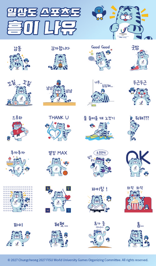 2027 충청 유니버시아드대회 조직위원회는 개최 D-500일을 기념해 마스코트 흥이&나유 네이버 스티커를 1년간 무료 배포한다. 흥이는 마을을 수호하고 사람들과 친근한 충청도 호랑이를, 나유는 지혜롭고 상서로운 새인 까치로, 나유에는 나와 너가 함께 즐기는 대회라는 뜻을 담고 있다. 스티커 24종은 네이버 OGQ마켓에서 무료로 내려받을 수 있다.