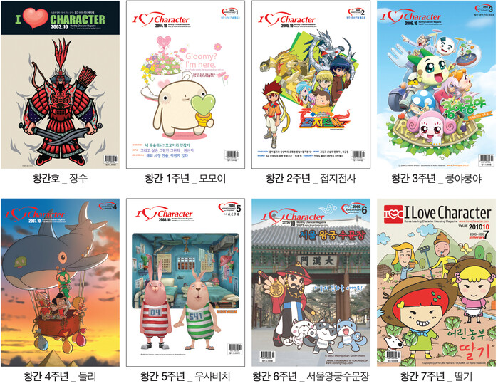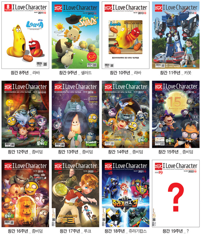 매거진의 얼굴은 표지다. 1년에 열두 번의 기회만 주어지는 월간<아이러브캐릭터>의 얼굴이 됐다는 건 그 시기에 가장 핫하거나 가장 돋보이고 싶은 콘텐츠라는 의미다. 2021년 10월 217호가 발간되기까지 , 지금은 기억에서 사라졌거나 지금도 여전히 사랑받는 수많은 콘텐츠가 월간<아이러브캐릭터>의 얼굴을 빛냈다. 그중 매년 10월 창간 기념호의 표지를 장식한 당대의 핫한 콘텐츠를 모아봤다.