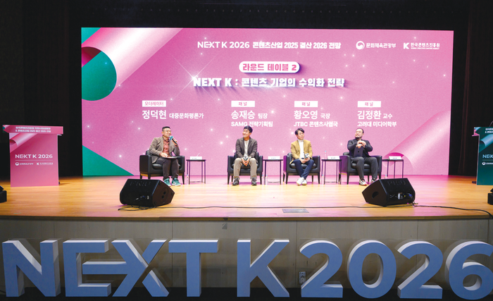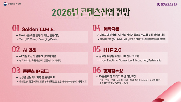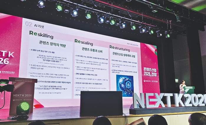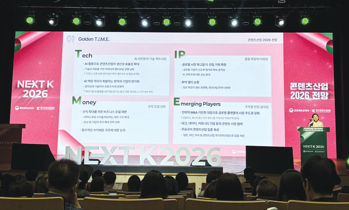 12월 17일 서울시 강남구 코엑스에서 열린 ‘NEXT K 2026’에서 콘진원이 제시한 키워드는 골든 T.I.M.E.·AI 리셋·콘텐츠 IP 리그·애착 자본·HIP 2.0·경계 감수성이다.