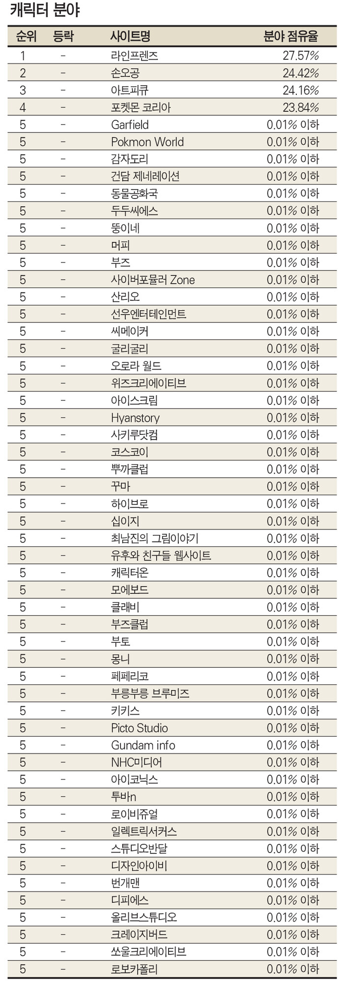 1위는 라인프렌즈 ( 분야점유율 27.57% , 등락 - ) , 2위 손오공 ( 분야점유율 24.42% , 등락 - ) , 3위 아트피큐 ( 분야점유율 24.16% , 등락 -) , 4위 포켓몬 코리아 ( 분야점유율 23.84% , 등락 -) , 5위 Garfield ( 분야점유율 0.01%이하 , 등락 - )