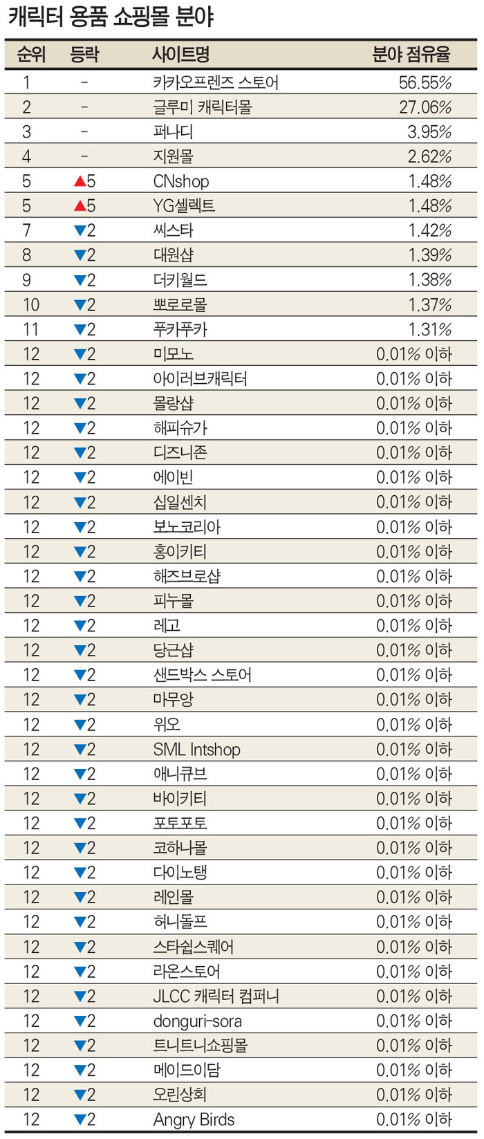 1위는 카카오프렌즈 스토어 ( 분야점유율 56.55% , 등락 - ) , 2위 글루미 캐릭터몰 ( 분야점유율 27.06% , 등락 - ) , 3위 퍼나디 ( 분야점유율 3.95% , 등락 - ) , 4위 지원몰 ( 분야점유율 2.62% , 등락 -) , 5위 CNshop ( 분야점유율 1.48% , 등락 ▲5 )