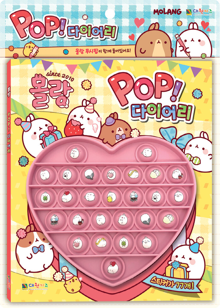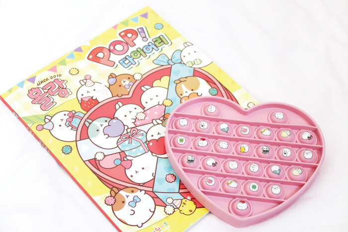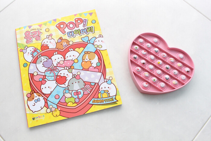 몰랑이 POP 다이어리는 하트 모양의 팝잇과 몰랑이 교환판 , 여러 게임을 위한 속지로 구성돼 아이들에게 선물하기 좋아요.