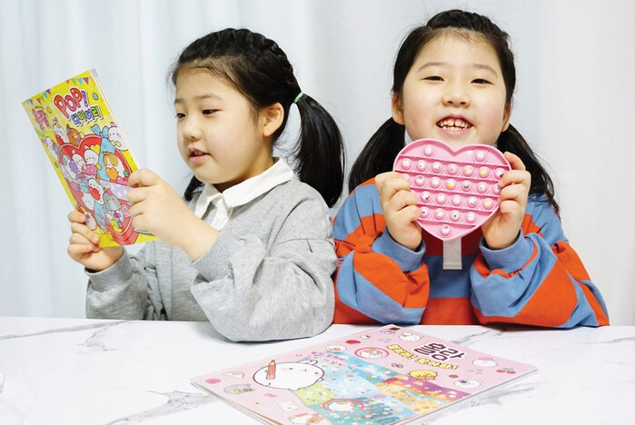 교환놀이 , 숨은그림찾기 등 친구들과 같이 놀 수 있도록 한 구성이 돋보여요. 하트 모양의 핑크색 몰랑이 팝잇은 정말 깜찍해요.