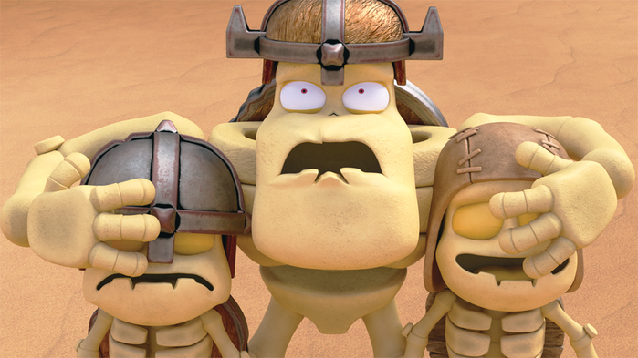싸우는 양 부족의 왕과 병사들이 나오는데 사실 캐릭터는 두 왕과 병사 딱 3종이다. 수염이나 소품만 다를 뿐 모두 똑같다. 스컬이니까.(웃음) 대신 캐릭터들이 풀어내는 상황극에 집중했다. 두 부족이 벌이는 황금성 쟁탈전이 이야기의 큰 흐름이지만 대결 장면은 52편 중에서 4∼5편마다 한 번 나올 정도로 비중이 작다. 대결 구도로는 공감을 끌어낼 만한 이야기가 나오기 힘들고 감정이입도 잘 안된다. 플롯이 단순해서 재미를 주기가 쉽지 않았다. 그래서 현실에서 겪을 만한 상황을 에피소드로 풀어내 시청자의 이입을 유도했다. 요즘 세태를 반영한 에피소드가 많다. 주종 관계에서의 갑질, 상대 적진으로 몰래 옮기는 배신 행위, 일부 몰지각한 젊은이들의 삐뚤어진 모습처럼 사회에서 마주할 만한 얘기가 많다. 대결 구도는 설정일 뿐, 그 속에서 벌어지는 캐릭터들의 일상과 관계에 더 초점을 맞췄다.