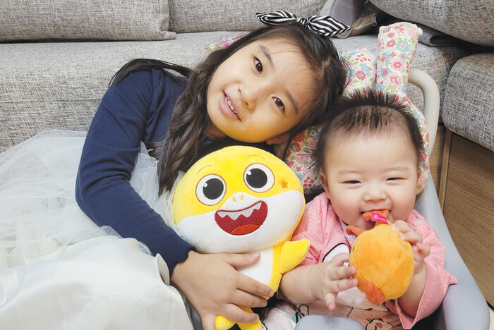 아기상어 올리 인형은 품에 쏙 안기는 크기라서 첫째 아이에게 , 올리의 단짝 윌리엄 인형은 손바닥만 한 크기여서 둘째 아이의 애착 인형이 됐어요.
