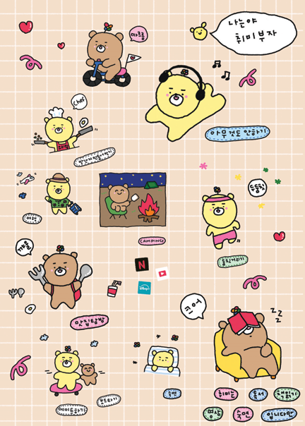 슬로건이 ‘탱자탱자 사는 게 꿈인 사람들 어서 오세요’다. 탱자탱자 노는 게 꿈이지만 현실은 그렇지 않은 탱장님의 일상을 그리고 이야기한다. 어딘가 널브러져 있거나 칼퇴근하기, 멍멍이들이랑 뒹굴기, 맛있는 빵 먹기 등 소소한 꿈을 위해 치열하게 노력하는 우리들의 모습을 담은 캐릭터다.