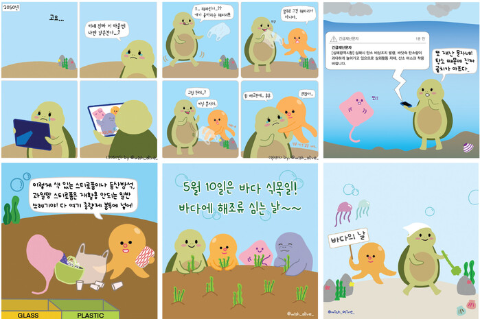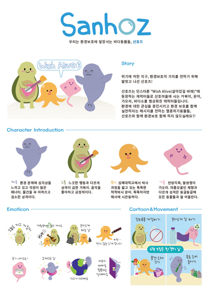 위기에 처한 지구 , 환경 보호의 가치를 전하기 위해 산호즈가 발 벗고 나섰다. 인스타툰 위시 얼라이브(Wish Alive , 살아남길 바라)에 등장하는 산호즈는 산호마을에 사는 거북이 , 문어 , 가오리 , 바다소를 형상화했다. 작가는 동물들과 함께 살아남자란 뜻을 담은 인스타툰을 통해 생명의 근원인 바다의 심각한 오염 상황을 전하고 손쉽게 실천할 수 있는 환경보호 방법들을 에피소드 형식으로 알린다. 올해 2021 GREEN 대한민국 7컷툰 공모전에서 은상 , 2021 국제캐릭터콘텐츠 공모대전에서 입상한 작가는 캐릭터라이선싱 페어에서 작품을 알리고 산호즈의 이야기를 담은 책도 출간할 계획이다.