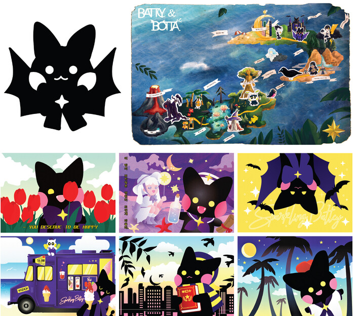 꼬마 뱀파이어 뱃시는 날개가 없는 대신 엄마가 만들어준 보라색 리본망토를 걸치고 있다. 다른 뱀파이어와 달리 날개도 없고 실수도 잦아 마법학교에서 따돌림을 당한다. 뱃시의 소원은 진짜 날개를 갖거나 솔메이트를 찾는 것. 그래서 세계여행을 떠나려 한다. 작가는 자신의 어린 시절을 반영한 캐릭터 뱃시를 통해 사람들과 섞이지 못한 채 고민하고 방황하는 등 어떤 콤플렉스가 있든 행복해질 자격이 있다는 메시지를 전한다. 지난해부터 일러스트레이션 페어에 참가해 다채로운 팬시류를 선보인 작가는 스토리를 강화해 판타지 웹툰을 인스타그램에 연재할 계획이다.