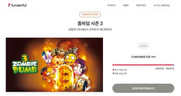 관련 업계에 따르면 ‘ 최초의 K-콘텐츠 투자 플랫폼 ’ 을 표방한 펀더풀은 최근 애니작이 준비 중인 애니메이션 좀비덤 시즌3에 대한 펀딩을 진행했다.