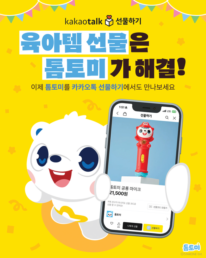 글로벌 키즈 콘텐츠 브랜드 톰토미가 카카오톡 선물하기에 입점했다. 스타원엔터테인먼트는 카카오톡 선물하기에서 톰토미 단독 기획 상품을 선보인다고 밝혔다.
