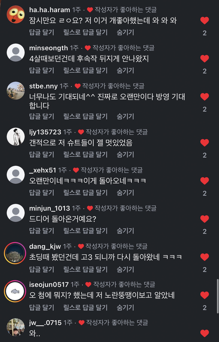 인스타그램에 올린 영상 조회수가 일주일 만에 12만 회를 넘어갔다. 댓글 하나하나 다 읽으면서 고생이 헛되지 않았다는 걸 느꼈다. 당시 글도 잘 쓰지 못했을 아이들이 커서 여전히 기억하고 있다는 게 너무 신기하다. 어느 커뮤니티에는 시즌1, 2를 비교하는 게시물도 있더라. 기분이 묘했다. 초심으로 돌아가 다시 창업한 느낌이었다. 온라인의 댓글을 보면 울컥 눈물이 난다. 그때를 기억하는 팬들이 다시 돌아와 줘 정말 기쁘다.
