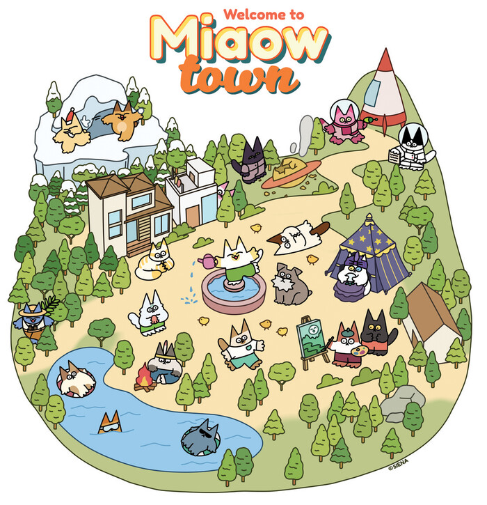 미야오타운은 묘한 포커페이스를 지닌 고양이 미야오들이 모여 살고 있는 세상이다. 사는 지역에 따라 미야오들의 복장이 다르고 털 역시 하양 , 노랑 , 점박이 등 다양하다. 각자 성격이 뚜렷한 미야오들은 서로 다르지만 어우러져 사이좋게 살고 있으며 개성이 다른 만큼 이야기도 각양각색이다. 스티커 , 금 속 배지 , 키링과 같은 캐릭터 상품을 선보이고 일부 미야오들의 이야기를 웹툰으로 연재한 작가는 캐릭터와 일러스트 , 굿즈를 지속적으로 개발하면서 다양한 형태로 미야오들을 소개할 계획이다.