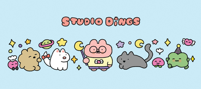 딩스프렌즈는 나만의 속도를 응원하는 캐릭터 브랜드다. 귀가 짧고 안경을 쓴 분홍 토끼 딩스, 하얀 진돗개 도지니, 네잎클로버 모양의 선인장 로로를 중심으로 지친 어른이의 일상을 위로한다. 나만의 속도로 천천히 나아가는 우리를 응원하며 ‘Slowly keep going, just be myself’의 메시지를 전한다.