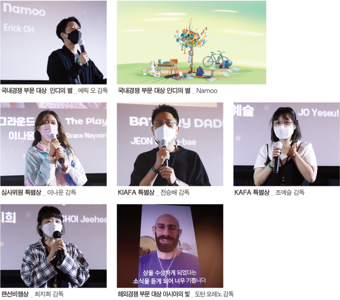 또 전승배 감독의 ‘ 건전지 아빠 ’ 가 KIAFA 특별상을 , 이나윤 감독의 ‘ The Playground(더 플레이그라운드) ’ 가 심사위원 특별상을 , ‘ RED TABLE(레드 테이블) ’ 의 토바야마사키 음악감독이 음악사운드 부문 특별상을 차지했고 새내기 감독에게 수여하는 초록이상은 백나현 , 백다현 감독의 ‘ Stereotype(스테레오타입) ’ 이 받았다.